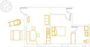 One-bedroom apartment with a fully equipped kitchenette and living room. With direct access to the garden.
