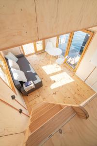 Botel má obývací prostor a koupelnu s fénem a sprchou. K dispozici je jídelní část a kuchyňský kout s lednicí.