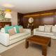 Apartmán má 3 ložnice, 2 koupelny, ložní prádlo, ručníky, TV se satelitními programy, kuchyň s kompletním vybavením a balkon s výhledem do zahrady. Koupelna je vybavená vanou.