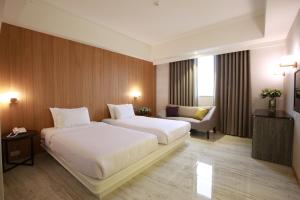 The spacious twin room provides air conditioning, a wardrobe, as well as a private bathroom featuring a hairdryer and slippers. This twin room offers an electric kettle, a TV and city views. The unit provides 2 beds.