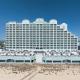 The suites at Hilton Suites Ocean City Oceanfront provide a separate living and seating area. They are decorated in beige colors and include a dining area. The bathroom features a whirlpool tub.