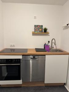Apartmán Hirschhausen - Wohnen im Grünen nahe Düsseldorf zahrnuje 1 ložnici, 1 koupelnu, ložní prádlo, ručníky, TV s plochou obrazovkou, jídelní kout a plně vybavenou kuchyň. Z balkonu ubytování Hirschhausen - Wohnen im Grünen nahe Düsseldorf se otevírá výhled do zahrady. Koupelna je vybavená sprchou.