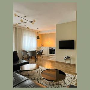 Die Ferienwohnung homey_prishtina verfügt über einen Balkon, 1 Schlafzimmer, ein Wohnzimmer und eine gut ausgestattete Küche. Es gibt einen Flachbild-TV.