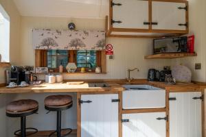 Oferta domu wakacyjnego obejmuje sypialnię (1), salon, kuchnię z pełnym wyposażeniem, w tym lodówką, a także łazienkę (1) z wanną z hydromasażem i suszarką do włosów. W domu wakacyjnym Honey Bee Shepherd's Hut - with Woodfired Hot Tub dla Gości przygotowano ręczniki i pościel.