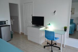 Dieses Zimmer verfügt über Kabel-TV, eine Mikrowelle und einen kleinen Kühlschrank.