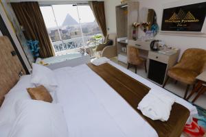El hostal o pensión ofrece habitaciones con aire acondicionado, escritorio, cafetera, nevera, microondas, caja fuerte, TV de pantalla plana y baño privado con ducha. Las habitaciones están equipadas con hervidor, algunas ofrecen balcón y otras también tienen vistas a la ciudad. En Horizon Pyramids View inn, todas las habitaciones tienen ropa de cama y toallas.