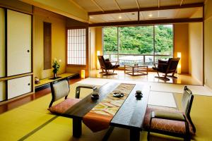 The family room includes a shared bathroom fitted with a bidet, a hairdryer and slippers. The family room has tatami floors, a seating area with a flat-screen TV, air conditioning, a tea and coffee maker as well as sea views. The unit has 8 futons.