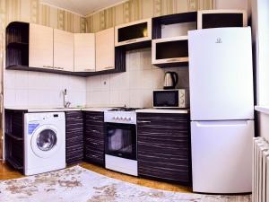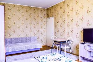 Apartmán v 1 комнатная квартира в Алматы zahrnuje 1 ložnici, obývací prostor s TV s plochou obrazovkou a plně vybavenou kuchyň.
