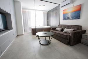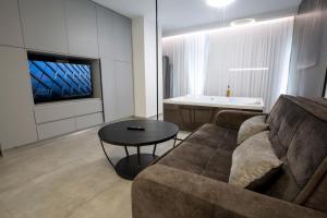 The hot tub is the standout feature of this apartment. This air-conditioned apartment features 1 living room, 1 separate bedroom and 1 bathroom with a shower. The apartment's kitchen, which has a refrigerator, is available for cooking and storing food. The apartment features a seating area, a wardrobe, a sofa, heating and a flat-screen TV. The unit has 2 beds.
