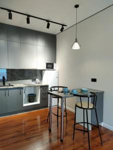 Die 1-Zimmer-Wohnung im 2 комнатная уютная 42 квартира bietet ein Wohnzimmer mit Flachbild-TV sowie eine voll ausgestattete Küche.