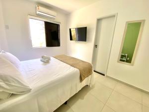 Klimatyzowany apartament 4B - Tranquilidade pertinho da praia de Itapuã posiada sypialnię i telewizor. Na miejscu znajduje się kuchnia.