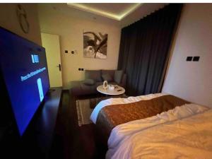 Este apartamento en #78استديو مفروش بجلسة خاصة إيجار يومي حطين - مرتاح cuenta con 1 dormitorio, aire acondicionado y TV de pantalla plana.