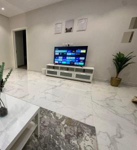 شقة ثلاث غرف نوم بالنرجس is composed of 2 bedrooms, a fully equipped kitchen, and 1 bathroom. A flat-screen TV is featured.
