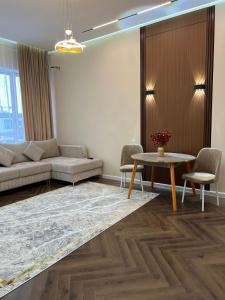 Apartmán v Стильные апартаменты рядом с Хан Шатыром zahrnuje 1 ložnici, obývací prostor s TV s plochou obrazovkou a plně vybavenou kuchyň.