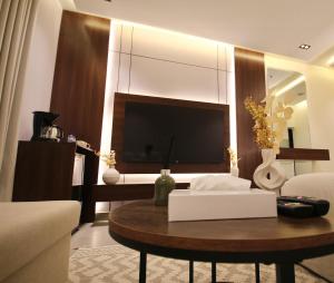 Klimatyzowany apartament posiada sypialnię i telewizor.