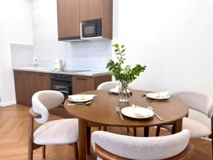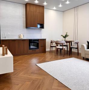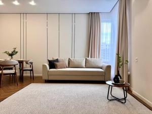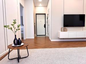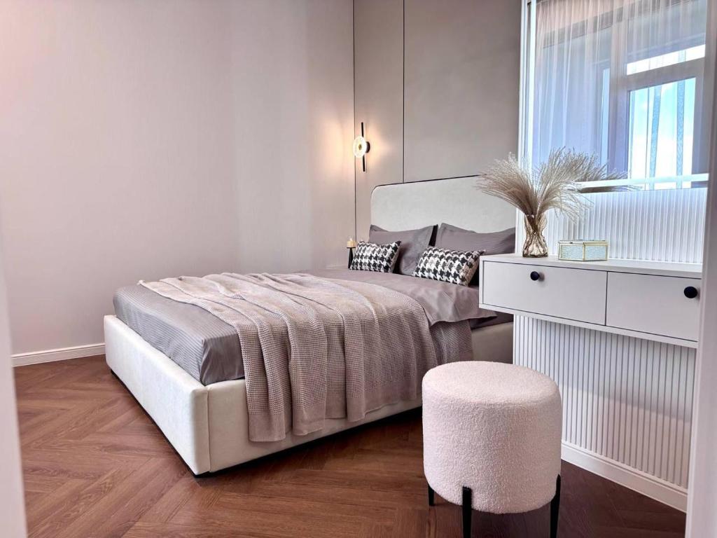Klimatizovaný apartmán v ЖК Гранд Туран má 1 ložnici, balkon a plně vybavenou kuchyň.