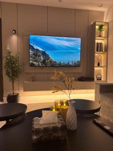 Apartament شقة بغرفة نوم وصالة ومطبخ بتصميم مميز وأنيق z 1 sypialnią oferuje salon z TV, kuchnię i łazienkę.