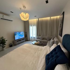 Apartament w 1BR , minute sea of Rakah w,58 TV , Self Check-in składa się z sypialni, łazienki oraz salonu. Wyposażenie obiektu 1BR , minute sea of Rakah w,58 TV , Self Check-in obejmuje telewizor z płaskim ekranem.