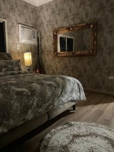 Klimatizovaný apartmán v فخامة السلامةغرفة وصالة má 1 ložnici, kuchyň a TV s plochou obrazovkou.