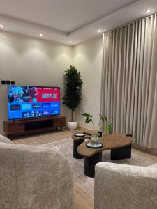 Klimatyzowany apartament شقة دور ارضي غرفة وصالة أنيقة دخول ذكي posiada sypialnię i telewizor.