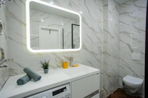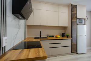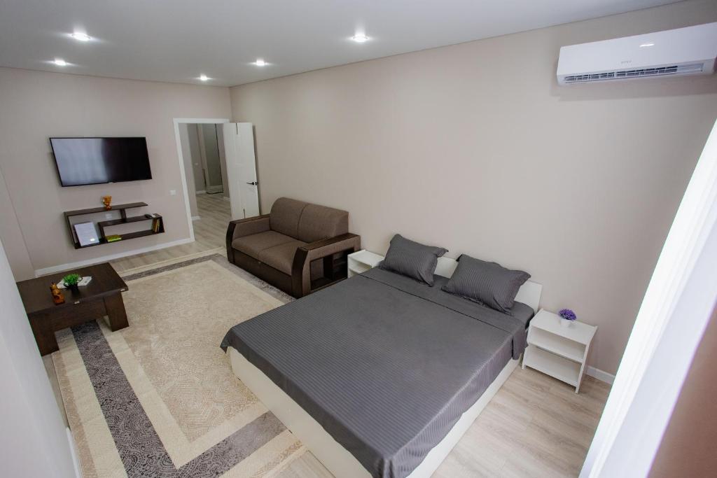 Die klimatisierte Ferienwohnung im 1 комнатная квартира в новом ЖК Панорама Парк по улице Темирбаева 50 bietet Zugang zu einem Balkon, 1 Schlafzimmer und eine voll ausgestattete Küche. Es gibt einen Flachbild-TV.