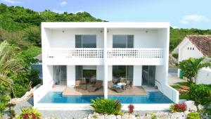 This holiday home features a pool with a view. Boasting a private entrance, this air-conditioned holiday home features 1 living room, 2 separate bedrooms and 1 bathroom with a bath and a shower. In the well-equipped kitchen, guests will find a stovetop, a refrigerator, kitchenware and a microwave. Featuring a terrace with sea views, this holiday home also features a washing machine and a flat-screen TV. The unit has 3 beds.