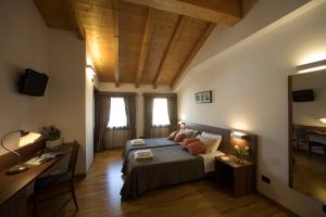 With wood-beamed ceilings, this bright room has parquet floors and a private bathroom.