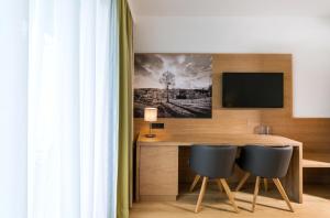 Room with a flat-screen TV, a balcony and a bathroom with a shower and a hairdryer.