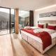 The panoramic wellness area includes an indoor pool, sauna, Turkish bath and hot tub. In winter, a ski storage space is available.