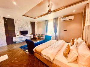 Všechny pokoje v ubytování Hotel 777 Pushkar - with best mountain view! swimming pool! big parking! lawn with bonfire! lavish & luxury AC rooms! top rated! best selling! prime location! property of the year! mají klimatizaci, psací stůl, TV s plochou obrazovkou, vlastní koupelnu, ložní prádlo, ručníky a terasu s výhledem na hory. Ve vlastní koupelně ubytování ubytování naleznete sprchu a bezplatné toaletní potřeby. Ve všech variantách ubytování v ubytování nechybí šatní skříň.