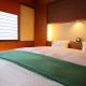 Room featuring a warm wooden decor, a double bed and soft indirect lighting. It comes with a couple of easy chairs, an LCD TV and a mini-fridge. An en suite bathroom and Japanese samue casual wear are provided.