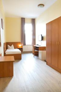 Modern room featuring cable TV, a desk and an en-suite bathroom with complimentary toiletries.