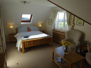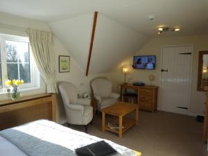 This room features a seating area with TV, tea/coffee making facilities, an en-suite bathroom, complimentary toiletries and bathtub with shower above.