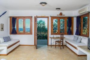 Air-conditioned studio with a kitchen, dining/living area, TV and sea-view balcony.