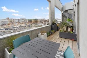 The spacious apartment with a terrace and city views features 2 bedrooms, a living room, a flat-screen TV, an equipped kitchen with a dishwasher and an oven, and 1 bathroom with a bath. Towels and bed linen are provided at Jardin du 8e Ciel - Neuf & Central. Jardin du 8e Ciel - Neuf & Central includes an outdoor dining area.