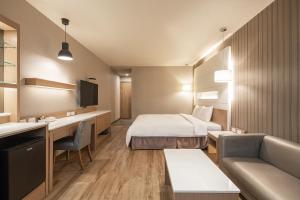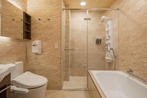Decorated in a classic tone, each guestroom is fitted with a sofa, a work desk, a TV and a refrigerator. Guests can find a hairdryer, slippers in the en suite bathroom.