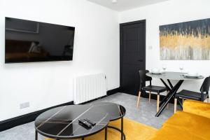 L'appartamento con 1 camera da letto presso King Bed - Sleeps 2 - Wi-Fi - Good Amenities Around Area - Smart TV's in All Rooms - Secure Entry - Get in touch Central Short Lets Dundee presenta soggiorno con TV a schermo piatto, cucina e bagno.