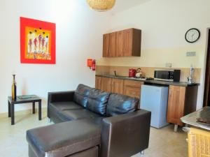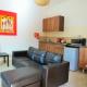 This apartment has a seating area, stovetop, fridge and microwave.