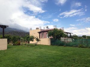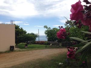 The holiday home includes a patio and terrace overlooking the sea and mountains. It features a seating area with TV and sofas. The kitchen is equipped with a stove, oven and microwave.