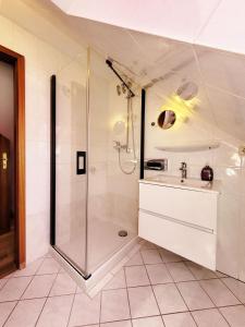 Apartmán v Kostengünstige & charmante Ferienunterkunft ohne Küche und in Strandnähe - Ideal für Kurztrips oder 1-Nacht Aufenthalte - inklusive Fahrradunterstellplatz disponuje 1 ložnicí a 1 koupelnou s fénem. Koupelna je vybavená sprchou.