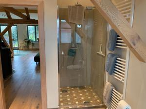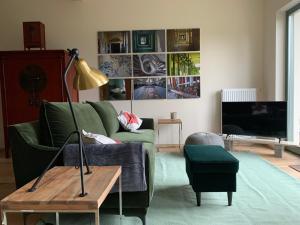 The Kranichhof Loft is a spacious, newly built apartment in the converted attic and extension of the old farmhouse. The very large living room with oak parquet has exposed roof beams and a high ceiling and, from the spacious balcony terrace, a view over the courtyard and landscape conservation area towards the sunset. In the large (about 50 square meters) living room there is a three-seater couch, a flat-screen TV, a desk, an antique cupboard, a comfortable leather armchair with footstool, a fireplace, an antique dining table with 6 leather chairs and a Ligne Roset Sofa bed, which is equipped with a topper. The lying area is 160x200 m. There is also an antique chest of drawers. An extra guest toilet is adjacent to the sofa bed. The fully equipped kitchen with built-in furniture, large refrigerator, fully automatic coffee machine, oven, dishwasher, kettle and toaster extends from this living room. The bed room with a walk-in shower and bathtub as well as a towel radiator is adjacent to the bedroom. The bedroom also has exposed beams, a large box spring bed, an antique wardrobe, 1 chair and oak parquet. There are radiators in all rooms except for the guest toilet. All windows have blinds and are triple-glazed. Please note that pets are only allowed in the following rooms: Loft and Studio Apartment.