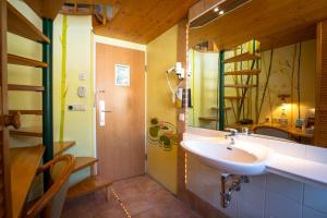 The room is equipped with a TV, desk and a wardrobe. Accessed via a spiral staircase, the sleeping area is 1.40 metres high and consists of a futon mattress.