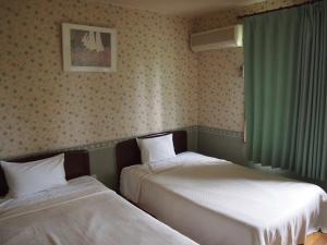 Air-conditioned room featuring rustic wallpaper, wooden floors and wooden furniture. It's equipped with a private bathroom, a TV and a fridge.