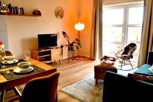 The apartment is fitted with 1 bedroom, 1 bathroom, bed linen, towels, a flat-screen TV, a dining area, a fully equipped kitchen, and a balcony with garden views. A private entrance leads into Küstenkoje, where guests can enjoy wine or champagne. Küstenkoje includes an outdoor dining area.