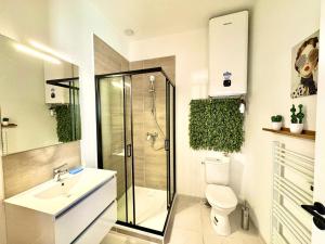Klimatizovaný apartmán L'Artelier,T2 centre Nîmes, lit 160, CLIM tvoří 1 ložnice, obývací pokoj, plně vybavená kuchyň s lednicí a troubou a 1 koupelna. Koupelna je vybavená sprchou.