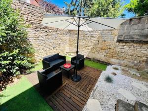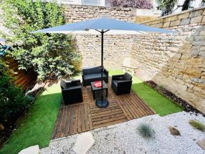 Apartmán L'Eden, Apt 4 Prs avec jardin en centre ville zahrnuje 1 ložnici, 1 koupelnu, ložní prádlo, ručníky, TV s plochou obrazovkou, jídelní kout a plně vybavenou kuchyň. Ubytování ubytování nabízí také terasu s výhledem do zahrady. V koupelně ubytování L'Eden, Apt 4 Prs avec jardin en centre ville nechybí sprcha ani fén.