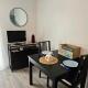 Die Küchenzeile ist ausgestattet mit einem Kühlschrank und einer Mikrowelle, einer Herdplatte sowie einer Kaffeemaschine.
