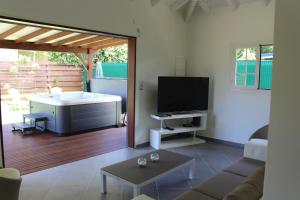 This holiday home features a hot tub. Boasting a private entrance, this air-conditioned holiday home features 1 living room, 2 separate bedrooms and 1 bathroom with a walk-in shower and a hairdryer. Guests will find a stovetop, a refrigerator, a dishwasher and kitchenware in the fully equipped kitchen. The holiday home also comes with a barbecue. Featuring a terrace with garden views, this holiday home also features a washing machine and a flat-screen TV. The unit has 2 beds.