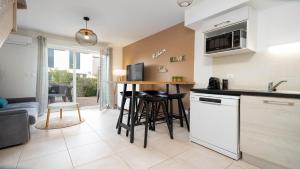 Klimatizovaná vila v La Dune N76 - VILLA 2P6 zahrnuje 2 ložnice, obývací prostor, kuchyň s lednicí a myčkou a 1 koupelnu. V koupelně ubytování La Dune N76 - VILLA 2P6 nechybí sprcha ani fén.