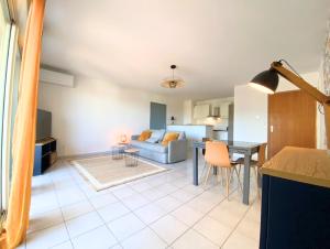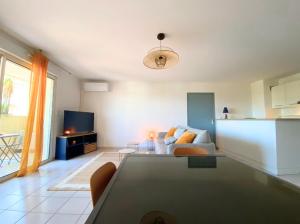 Apartament La Palmeraie T2, terrasse, clim, pkg, centre ville oferuje taras, 1 sypialnię, salon i świetnie wyposażoną kuchnię z lodówką i zmywarką. Ręczniki i pościel są dostępne w apartamencie La Palmeraie T2, terrasse, clim, pkg, centre ville.